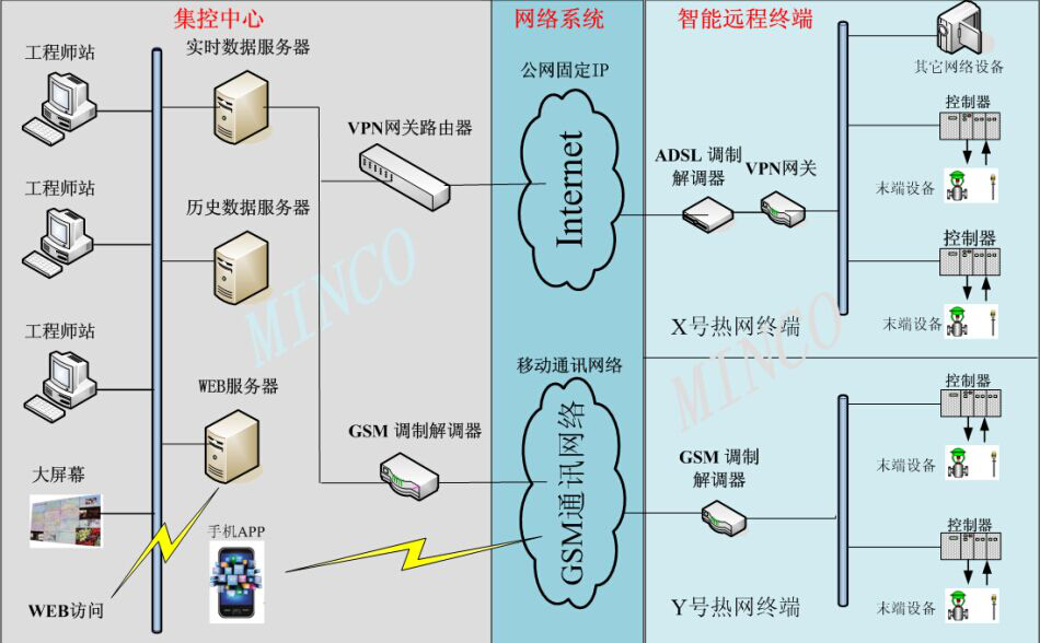 通讯网络:即监控中心与换热站远程终端之间的信息高速公路。通讯网络有多种方式可以应用,如宽带专线、VPN、无线网桥、移动通讯网络等。