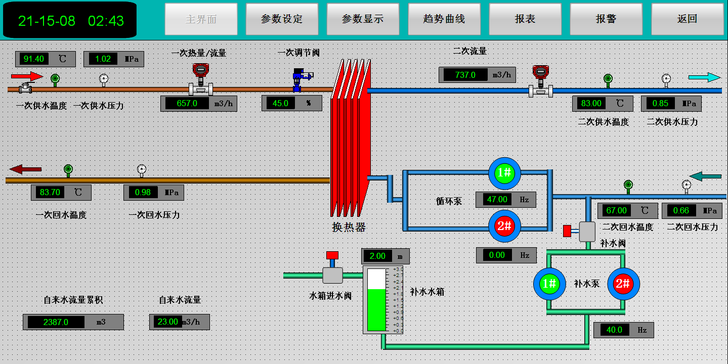 一次调节阀或者一次增压泵、一次侧热量计1套或一次侧流量计1套、一次侧供回水压力传感器共2套、一次侧供回水温度传感器共2套;2套机组循环泵(每套2台一用一备)、2套机组补水泵(每套2台一用一备)、二次供水流量计2套、二次侧供回水压力传感器共4套、二次侧温度传感器共4套、清水补水电磁阀2个、泄水阀2个等。